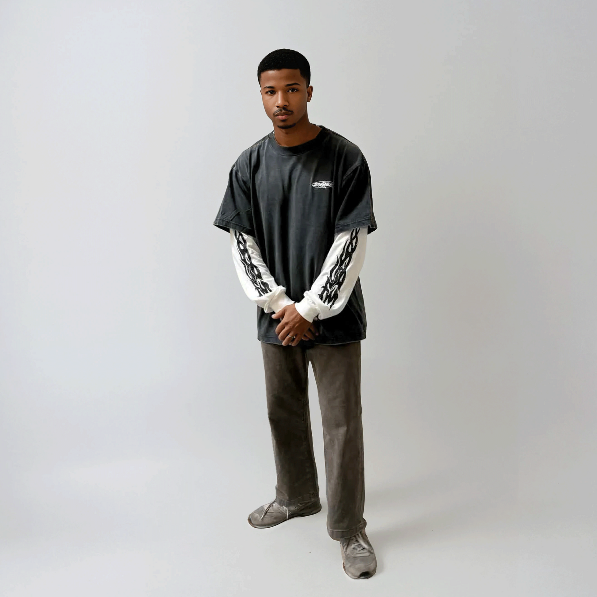 Our Combo Longsleeve Tee brings that layered look without the bulk. Designed to feel like two shirts but built as one, it’s extra comfortable and easy to wear all day. FangMoto flame prints run down both sleeves, bringing heat to the fit while the oversized cut keeps it laid-back and effortless. Whether you’re out riding or just posted up, this hybrid tee is ready to be in heavy rotation.